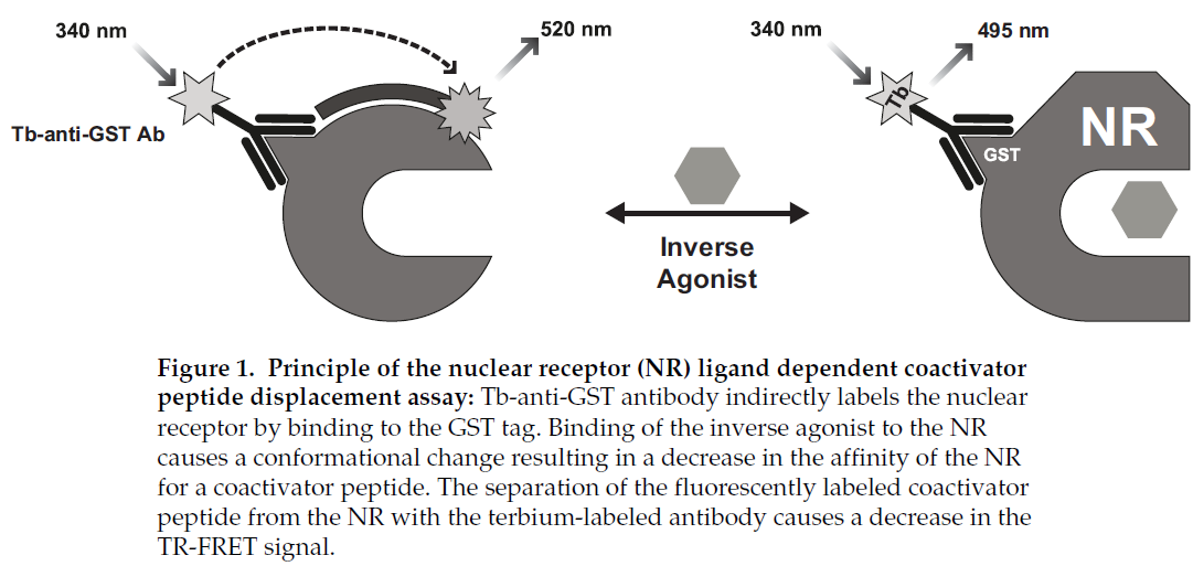 The LanthaScreen® ERR (estrogen related receptor) alpha TR-FRET Coactivator Assay provides a sensitive and robust method for high-throughput screening of potential ERR alpha ligands as inverse agonists (sometimes referred to as antagonists) of coactivator displacement. The kit uses a terbium (Tb)-labeled anti-GST antibody, a fluorescein-labeled coactivator peptide, and an ERR alpha ligand-binding domain (ERR alpha-LBD) that is tagged with glutathione-S-transferase (GST), in a homogeneous mix-and-read assay format.