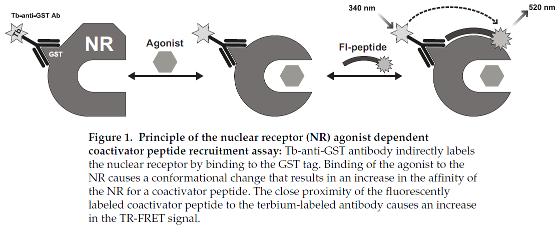 When running the LanthaScreen® TR-FRET CAR Coactivator Assay, CAR-LBD is added to ligand test compounds followed by addition of a mixture of the fluorescein-coactivator peptide and terbium anti-GST antibody. After an incubation period at room temperature, the 520 nm/ 495 nm TR-FRET ratio is calculated and can be used to determine the EC50 from a dose response curve of the compound. Based on the biology of the CAR-coactivator peptide interaction, this ligand’s EC50 is a composite value representing the amount of ligand required to bind to receptor, effect a conformational change, and either recruit or displace coactivator peptide (Figures 1 and 2).