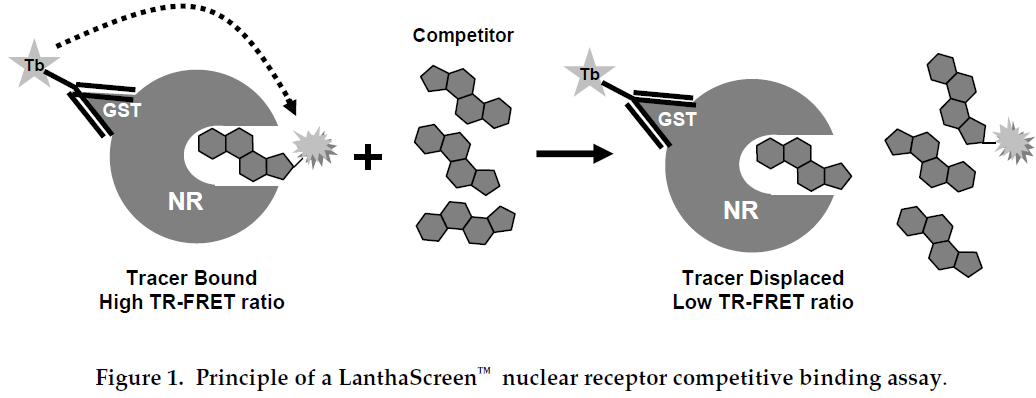 To assay: When running the LanthaScreen® TR-FRET PPAR alpha Competitive Binding Assay, Fluormone™ Pan-PPAR Green is added to ligand test compounds followed by addition of a mixture of the PPAR alpha-LBD and terbium anti-GST antibody. When the Fluormone™ Pan-PPAR Green is bound to PPAR alpha, energy transfer from the terbium-labeled antibody to the tracer occurs, and a high TR-FRET ratio is observed. Competitive ligand binding to PPAR alpha is detected by a test compound’s ability to displace the tracer, which results in a loss of FRET between the antibody and the tracer. After an incubation period at room temperature, the 520 nm/495 nm TR-FRET ratio is calculated and can be used to determine the IC50 from a dose response curve of the compound (Figure 1). This type of binding assay is analogous to radioligandbased assays, except that it eliminates handling of radioactivity and enables a homogeneous "addition-only" format.