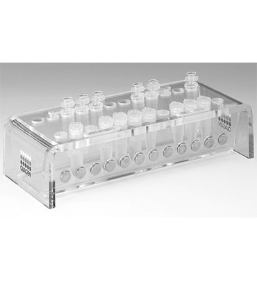 The 12-Tube Magnet can be used for 6xHis-tagged–protein magnetocapture assays or purification procedures performed with Ni-NTA Magnetic Agarose Beads. The magnet consists of a series of 12 powerful NdFeB (neodymium-iron-boron) magnetic disks. Each magnetic disk attracts the beads in a 1.5 ml or 2 ml tube fitted in an adjacent hole. After capture of 6xHis-tagged proteins, the magnetic beads are pulled to the side of the tubes and kept in place while buffers are exchanged. A second series of holes allows resuspension of the magnetic beads away from the magnetic field to enable thorough