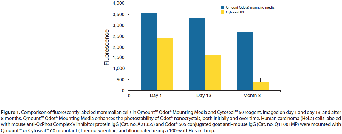Qdot nanocrystals are composed of semi-conductor material to generate a fluorescent particle which is exceptionally bright and does not photobleach. Qdot nanocrystals paired with the correct optical filters are as much as 50 times brighter than traditional organic dyes.