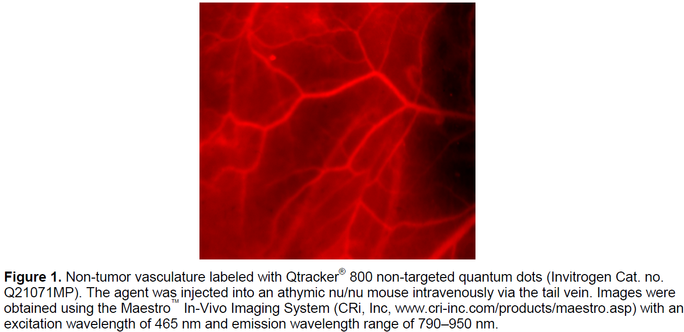 Qtracker® non-targeted quantum dots are designed to be injected into the tail vein of mice for the study of vascular structure using small animal in vivo imaging (SAIVI) techniques. These nanocrystals exhibit intense fluorescence with red-shifted emission for increased tissue penetration, and have a PEG surface coating specially developed to minimize nonspecific interactions and reduce immune response by the tissue. Because the PEG surface coating does not contain reactive functional groups, the Qtracker® non-targeted quantum dots are retained in circulation longer and can be imaged for up to 3 hours with a single injection or for longer periods of time with additional injections.