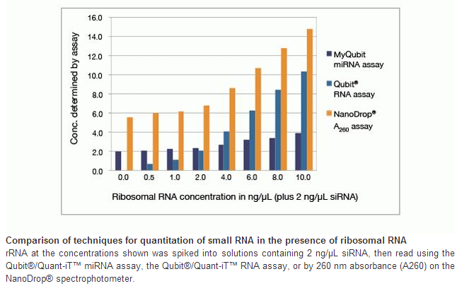 The Quant-iT™ microRNA Assay Kit allows easy and accurate quantification of microRNA (miRNA), even in the presence of common contaminants such as salts, free nucleotides, solvents, detergents, and protein. The assay is highly selective for microRNA over rRNA or large mRNA (>1000 bp). Although the reagent is not exclusively selective for miRNA, we have been able to reproducibly quantify miRNA in pure samples at levels as low as 0.5 ng following the supplied protocol, even in the presence of mRNA.