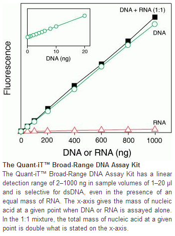 The Quant-iT™ Broad-Range dsDNA Assay Kit makes DNA quantitation easy and accurate. The kit provides concentrated assay reagent, dilution buffer, and pre-diluted DNA standards. The assay is highly selective for double-stranded DNA over RNA, and in the range of 2-1000 ng of DNA, the fluorescence signal is linear. A Quant-iT™ dsDNA Assay Kit with a range of 0.2-100 ng of dsDNA is available (Q33120), and we also offer a Quant-iT™ RNA Assay Kit (Q33140).