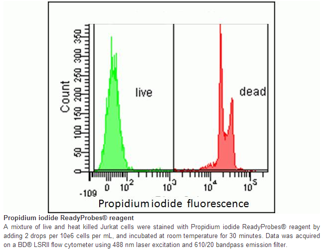 Features of Propidium Iodide ReadyProbes® Reagent: • Ready-to-use liquid propidium iodide formulation • Rapid staining of dead cells without wash steps • Ready-to-use liquid formulation in convenient dropper bottle—no need to dilute, weigh, or pipette • Stable at room temperature—keep handy at your work station or cell culture area