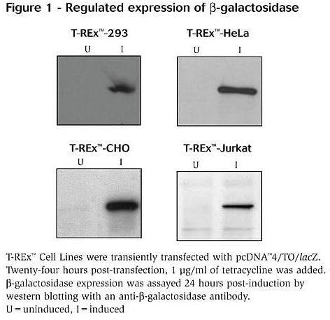 T-REx™ Cell Lines stably express the tetracycline repressor protein (Table 1). They save significant time and effort when using the T-REx™ System. The T-REx™ Cell Lines are functionally tested by transient transfection with the positive control vector pcDNA™4⁄TO⁄lacZ. T-REx™ Cell Lines exhibit extremely low basal expression levels in the repressed state and high expression upon induction with tetracycline.