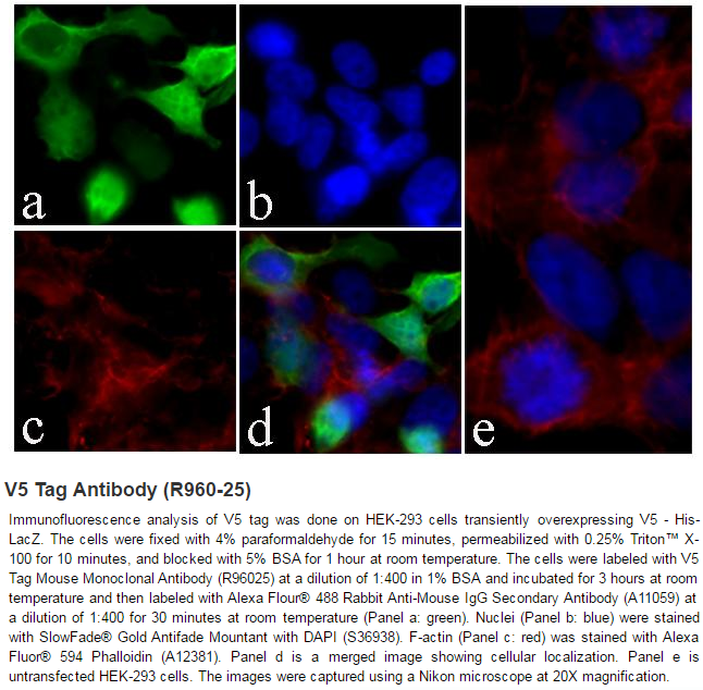 This antibody has also been used successfully to immunoprecipitate fusion proteins that contain theV5 epitope.