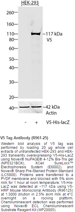 This antibody is functionally tested against 500ng of an E. coli expressed fusion protein containing a V5 epitope using a chemiluminescent substrate at a 10 minute exposure. This antibody has also been tested in Western blot against 50ng of recombinant Positope™ protein. The Positope™ control protein is a 53 kDa recombinant protein that contains seven epitope tags, including His (C-term), HisG, c-myc, and V5. Low background was observed using chemiluminescent or alkaline phosphatase reagents for detection. For Western blot, dilute in PBS or Tris-Buffered Saline (TBS) containing 0.05% Tween-20 and 5% nonfat, dry milk (PBSTM or TBSTM).