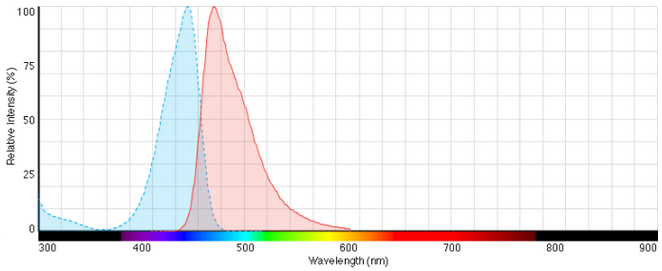 SYTOX® Blue nucleic acid stain is an excellent blue-fluorescent nuclear and chromosome counterstain that is impermeant to live cells, making it a useful indicator of dead cells within a population. The excitation/emission maxima for the dye bound to DNA are 444/480 nm.