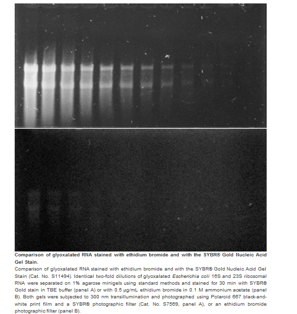 SYBR Gold 核酸凝胶染料 是用于检测天然环境、乙二醛、甲醛或尿素凝胶中 dsDNA、ssDNA 和 RNA 的最灵敏的凝胶染料。 用于 UV 透射仪、黑暗读数器 (Dark Reader) 或者激光扫描仪。 500 µL 可对 50 块微型凝胶进行染色。