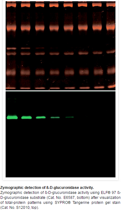 SYPRO Tangerine protein gel stain provides fast, easy and sensitive detection of proteins in gels (down to 4 ng/band) without the need for fixatives. Staining is compatible with subsequent Western blotting, zymography, electroelution or mass spectrometry. Compared to Coomassie Brilliant Blue and silver staining, SYPRO Tangerine stain provides more consistent protein-to-protein staining and a much broader linear quantitation range (over three orders of magnitude). Stained proteins can be viewed with a standard UV or blue-light transilluminator or with a laser scanner. For optimal sensitivity with Polaroid film, use of the SYPRO protein gel stain photographic filter (S-6656) is recommended.