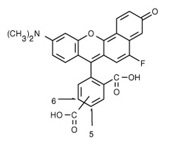 The cell-impermeant ratiometric pH indicator SNARF®-5F 5-(and-6)-carboxylic acid (pKa of ~7.2) exhibits a significant pH-dependent emission shift from yellow-orange to deep red fluorescence under acidic and basic conditions, respectively. This pH dependence allows the ratio of the fluorescence intensities from the dye at two emission wavelengths - typically 580 nm and 640 nm - to be used for quantitative determinations of pH.