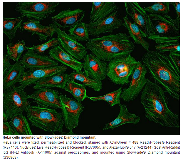 SlowFade® Diamond Antifade Mountant is a glycerol-based liquid mountant applied directly to fluorescently labeled cells or tissue samples on microscope slides. SlowFade® Diamond mountant provides superior antifade protection across the entire visual and IR spectrums. You can use SlowFade® Diamond mountant with almost any fluorescent dye or fluorescent protein (e.g., GFP, RFP, mCherry)to achieve the brightest signal and lowest background.