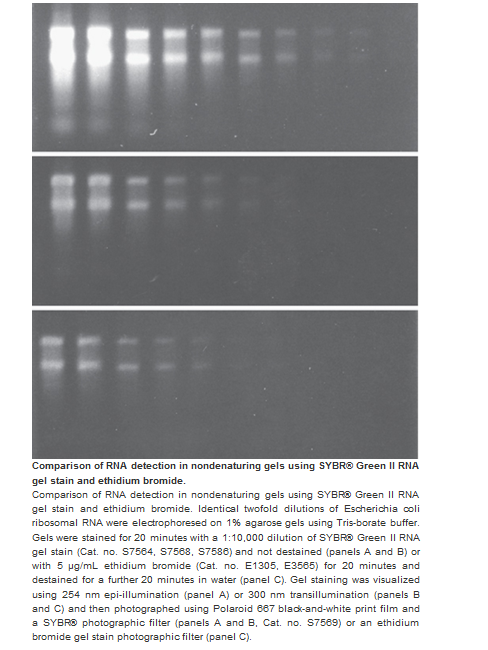 SYBR Green II RNA 凝胶染料是灵敏的核酸凝胶染料,结合 RNA 时发出明亮的荧光并且凝胶背景很低,因此对于甲醛/琼脂糖或聚丙烯酰胺凝胶非常理想(使用激光扫描仪或标准 UV 透射仪)。 500 µL 可对 50 块微型凝胶进行染色。 可提供 1 ml 单位大小 (S-7568) 和特殊包装 (S-7586)。