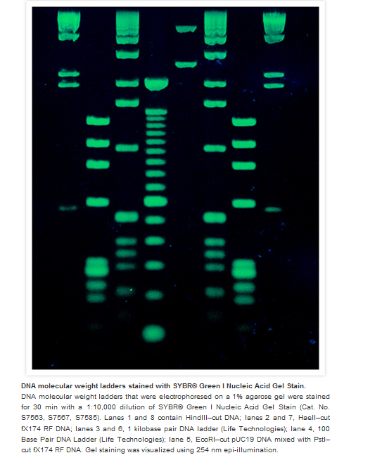 这种极为灵敏的核酸凝胶染料在结合 dsDNA 时发出明亮的荧光并且凝胶背景很低,因此对于使用激光扫描仪或标准 UV 透射仪检测 dsDNA 的应用非常理想。 SYBR Green I 核酸凝胶染料也可用于毛细管电泳、实时 PCR 测定和条带偏移测定中。 1 ml 可以对 100 块微型凝胶进行染色。 可提供 500 µL 单位大小 (S-7563) 和特殊包装 (S-7585)。
