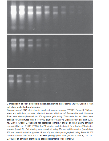 The SYBR photographic filter provides optimal filtration for photographing gels stained with SYBR Green I, SYBR Green II and SYBR Gold nucleic acid gel stains. This filter is a 75 mm x 75 mm gelatin square that fits beneath the lens of a Polaroid camera in a typical darkroom set-up.