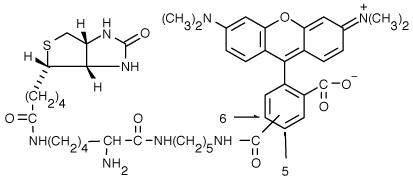 The water-soluble neuronal tracer 5-(and-6)-tetramethylrhodamine biocytin (biocytin TMR)can be detected in fixed tissues by using avidin or streptavidin probes. However, tetramethylrhodamine biocytin can also be observed directly in fixed or unfixed samples because the attached tetramethylrhodamine dye produces bright, orange-fluorescence (absorption/emission maxima ~554/581 nm).