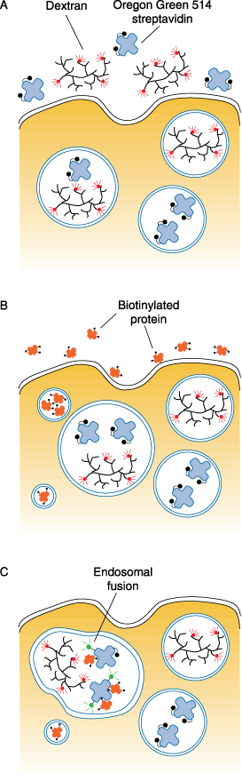 Transferrin is a monomeric serum glycoprotein (~80,000 daltons) that binds to a specific receptor on the surface of vertebrate cells and delivers up to two Fe3+ atoms via receptor-mediated endocytosis—our labeled LDL complexes are useful tools for studying this phenomenon. Once iron-carrying transferrin proteins are inside endosomes, the acidic environment favors dissociation of iron from the transferrin–receptor complex. Following the release of iron, the apotransferrin is recycled to the plasma membrane, where it is released from its receptor to scavenge more iron. Fluorescent transferrin conjugates can therefore be used with fluorescent LDL to distinguish the lysosomally directed and recycling endosomal pathways.