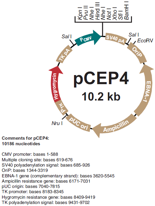 These vectors are designed for high-level, constitutive expression from either the CMV or RSV promoters. Both vectors contain the EBNA-1 gene for episomal expression in primate and canine cell lines.