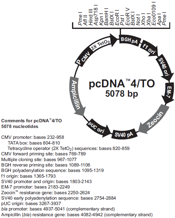 In addition, pcDNA™4/TO/myc-His offers a c-myc epitope for rapid detection of the recombinant protein with an Anti-myc Antibody and a polyhistidine (6xHis) sequence for simple purification of the recombinant protein with nickel-chelating resin and detection with Anti- His(C-term) Antibody.