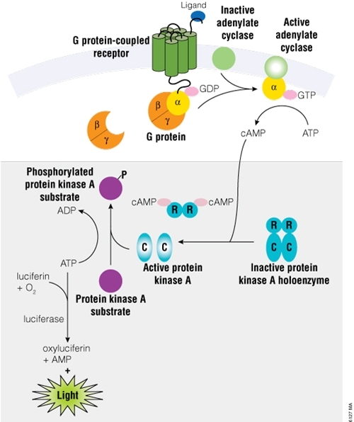 cAMP-Glo™ Assay 是一种均质的、利用生物发光原理检测细胞内cAMP 水平的高通量方法。cAMP-Glo™ Assay 可检测出细胞体内应答G 蛋白偶联受体(GPCR) 上的测试化合物效应而生成的cAMP。与腺苷酸环化酶偶联的GPCRs 会升高或降低胞内的cAMP。这种检测方法的原理是:环状AMP (cAMP) 促进蛋白激酶A(PKA) 全酶的活性,降低ATP,从而引起偶联的萤光素酶(luciferase)反应光信号降低。
