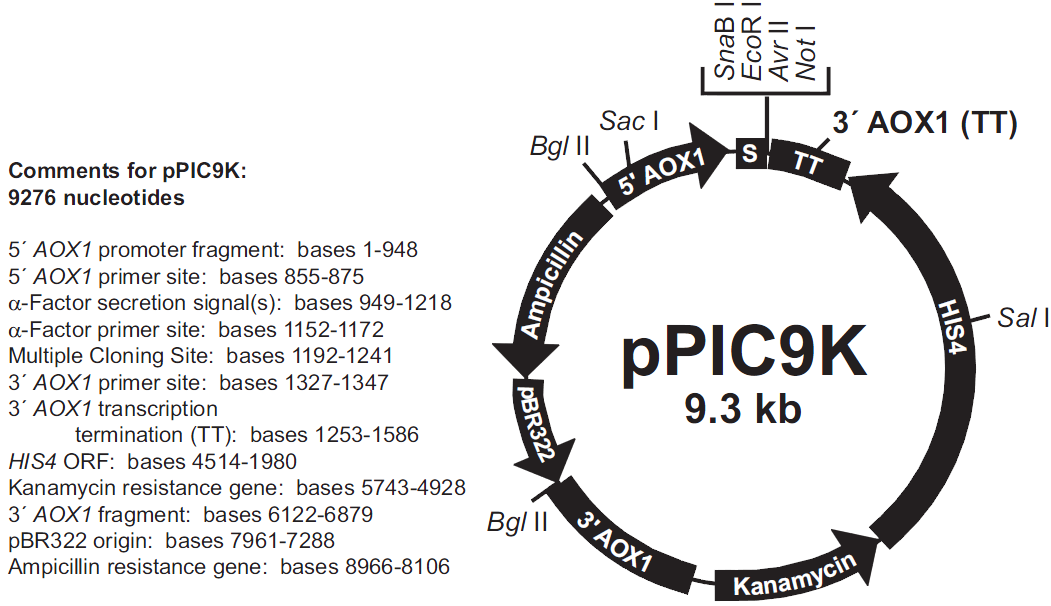 The pPIC9K vector carries the kanamycin resistance gene that confers resistance to Geneticin® Reagent in Pichia. Spontaneous generation of multiple insertion events can be identified by resistance to increased levels of Geneticin® Reagent. Pichia transformants are selected on histidine-deficient medium and screened for their level of resistance to Geneticin® Reagent. The ability to grow in high concentrations of Geneticin® indicates that multiple copies of the kanamycin resistance gene and the gene of interest are integrated into the genome. The pPIC9K vector directs secretion of expressed proteins. This vector is included in the Multi-CopyPichia Expression Kit.