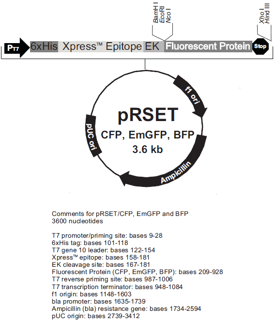 The pRSET-EmGFP, pRSET-CFP and pRSET-BFP vectors allow you to fuse a protein of interest to the widely used and well-characterized fluorescent proteins from the jellyfishAequorea victoria (1,2) using the pRSET expression vector. These vectors contain the next-generation EGFP, Emerald Green Fluorescent Protein (EmGFP), which has been further optimized for mammalian expression, as well as Cyan (CFP) and Blue (BFP) Fluorescent Proteins for simple, noninvasive detection of recombinant protein.