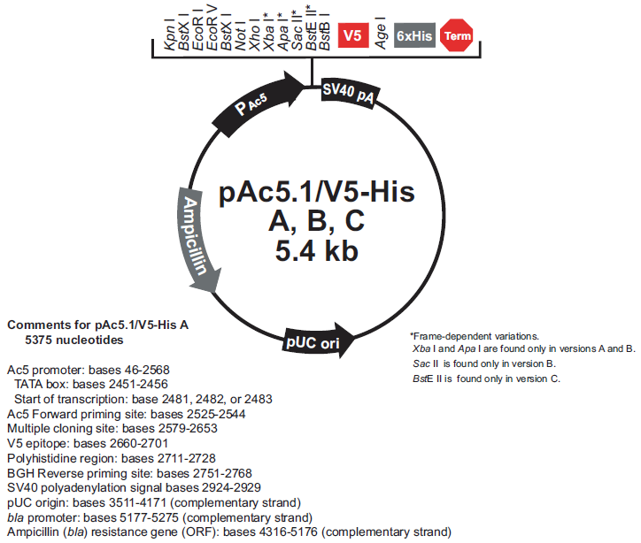 The DES®-Constitutive Kit provides the vector pAc5.1/V5-His for high-level constitutive expression of recombinant proteins and a choice of Blasticidin (pCoBlast) or hygromycin (pCoHygro) selection. The vector offers the strong, constitutive promoter from the Drosophilaactin 5C gene. The pAc5.1/V5-His vector also offers the following features: