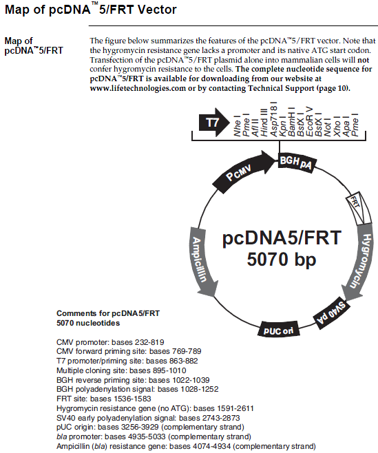 pcDNA5⁄FRT vector is a 5.1 kb expression vector designed for use with the Flp-In™ System. This vector features: 1. CMV promoter for high level expression in mammalian cells; 2. ten unique restriction site for easy cloning; 3. FLP Recombination Target (FRT) site for Flp recombinase-mediated integration of the vector into the Flp-In™ host cell line and 4. Hygromycin resistance gene for selection of stable cell lines.