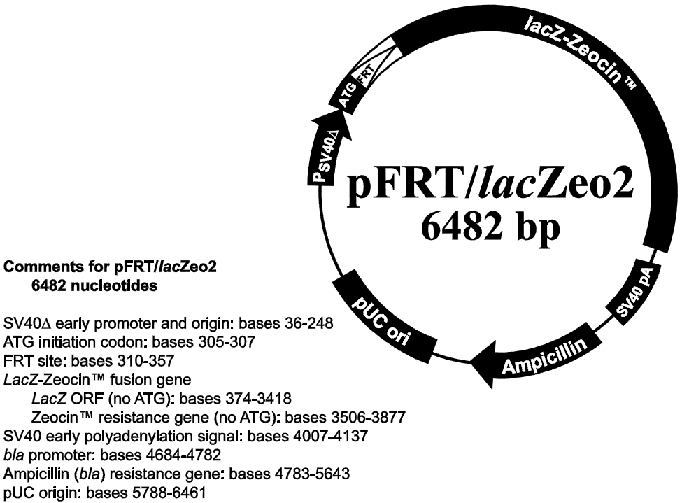 pFRT/lacZeo and pFRT/lacZeo2 were constructed for establishing Flp-In™ Cell Lines that contain a single FRT site. Each vector includes a:
