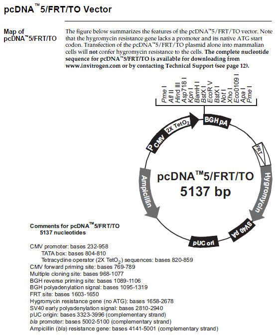 The pcDNA™5⁄FRT⁄TO vector contains the following elements: