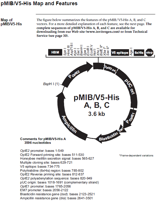 • The OpIE2 promoter for constitutive expression • The honeybee melittin (HBM) secretion signal to allow secreted expression of your protein • The Blasticidin resistance gene for rapid selection of stably transfected cell lines in two weeks • C-terminal V5-epitope and polyhistidine tag for detection with Invitrogens Anti-V5 antibody and purification with nickel-chelating resin