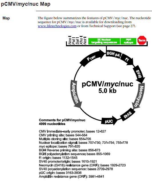 • Strong mammalian promoter (CMV or EF-1É) for constitutive expression of your protein of interest • C-terminal c-myc epitope for detection with an Anti-myc Antibody • Bovine Growth Hormone (BGH) polyadenylation site for mRNA stability • f1 origin for single-stranded rescue of sense DNA • Neomycin resistance gene for selection of mammalian cells with Geneticin¤ selection agent • Ampicillin resistance and pUC origin for selection and maintenance in E. coli