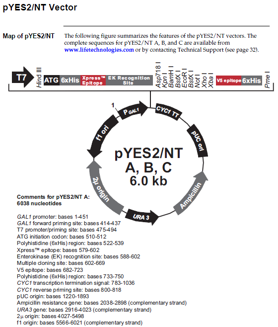 pYES2/NT and pYES2/CT are S. cerevisiae expression vectors derived from the parental pYES2 vector. Both vectors offer the URA3 gene for selection in yeast. pYES2/NT features an N-terminal Xpress™ epitope for detection with Invitrogen's Anti-Xpress™ Antibody and a polyhistidine (6xHis) tag for purification with nickel-chelating resin. pYES2/CT contains a C-terminal V5 epitope for detection and a polyhistidine (6xHis) tag for purification.