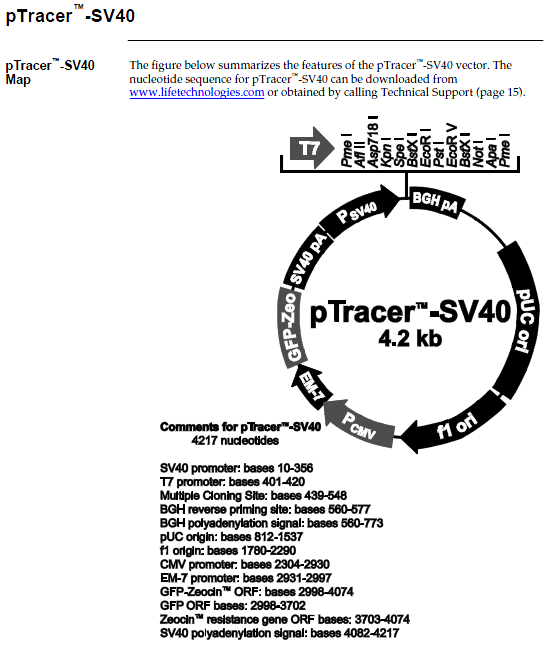 The pTracer™-SV40 vector offers: • SV40 promoter for high-level constitutive expression of your gene of interest • CMV promoter for high-level constitutive expression of the Cycle 3 GFP-Zeocin™ fusion • SV40 origin for episomal replication and simple vector rescue in cell lines expressing the SV40 large T antigen