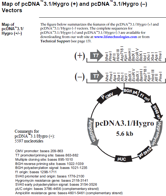 The pcDNA™3.1 Expression Vector Family Three untagged versions of pcDNA™3.1 (available separately), each with a different selectable marker (Geneticin®, Zeocin™, or Hygromycin), are for use alone or in co-transfections. All three vectors offer the following features: • Cytomegalovirus (CMV) enhancer-promoter for high-level expression • Large multiple cloning site in either forward (+) or reverse (-) orientations • Bovine Growth Hormone (BGH) polyadenylation signal and transcription termination sequence for enhanced mRNA stability • SV40 origin for episomal replication and simple vector rescue in cell lines expressing the large T antigen (i.e., COS-1 and COS-7) • Ampicillin resistance gene and pUC origin for selection and maintenance in E. coli