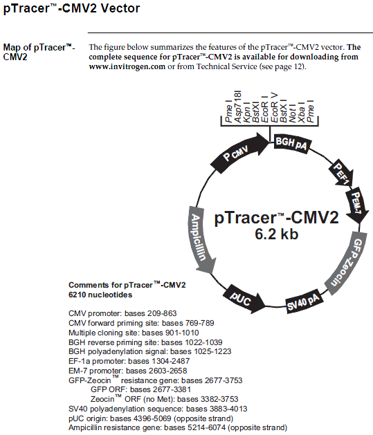 The pTracer™-CMV2 vector offers: • CMV promoter for high-level constitutive expression of your gene of interest • EF-1α promoter for high-level constitutive expression of the Cycle 3 GFP-Zeocin™ fusion • Ampicillin resistance gene for selection in E. coli