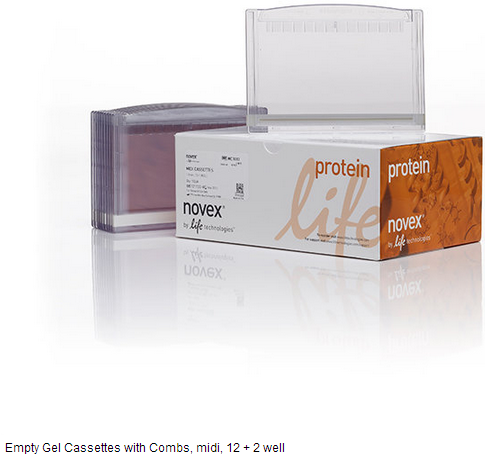 These empty gel cassettes are pre-assembled, single-use, empty plastic cassettes with combs that allow you to pour your own midi-size gels. An XCell4 SureLock™ Midi-Cell Runner is required to run the gels. The cassettes are sealed on three sides to prevent leaking and do not require the use of a special casting stand. Gels poured in these cassettes are 1.0 mm thick. The cassettes have printed well outlines for easier gel loading.