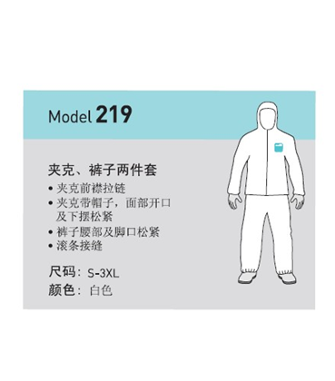 夹克和裤子两件套;夹克前襟拉链;夹克带帽子,面部开口及下摆松紧;裤子腰部及脚口松紧;滚条接缝。