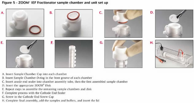 Sample Chamber and Fractionator Unit Set-up ProcedureFigures 4-6 illustrate assembly of the sample chambers and fractionator unit. The sample chamber and components fit together easily and offer a leak-proof seal. Simply place disks between the sample chambers in the ZOOM® IEF Fractionator to allow separation in a specific pH range. For example, if you want to fractionate proteins between pH 4.6 and 5.4, flank a sample chamber with a ZOOM (r) Disk of pH 4.6 and one of pH 5.4.Downstream Processing by 2D Gel ElectrophoresisFollowing fractionation, the separated samples can be subjected to further analysis using narrow or broad range ZOOM® Strips on the ZOOM® IPGRunner™ System. Follow with second dimension analysis using neutral pH NuPAGE® ZOOM® Gels.
